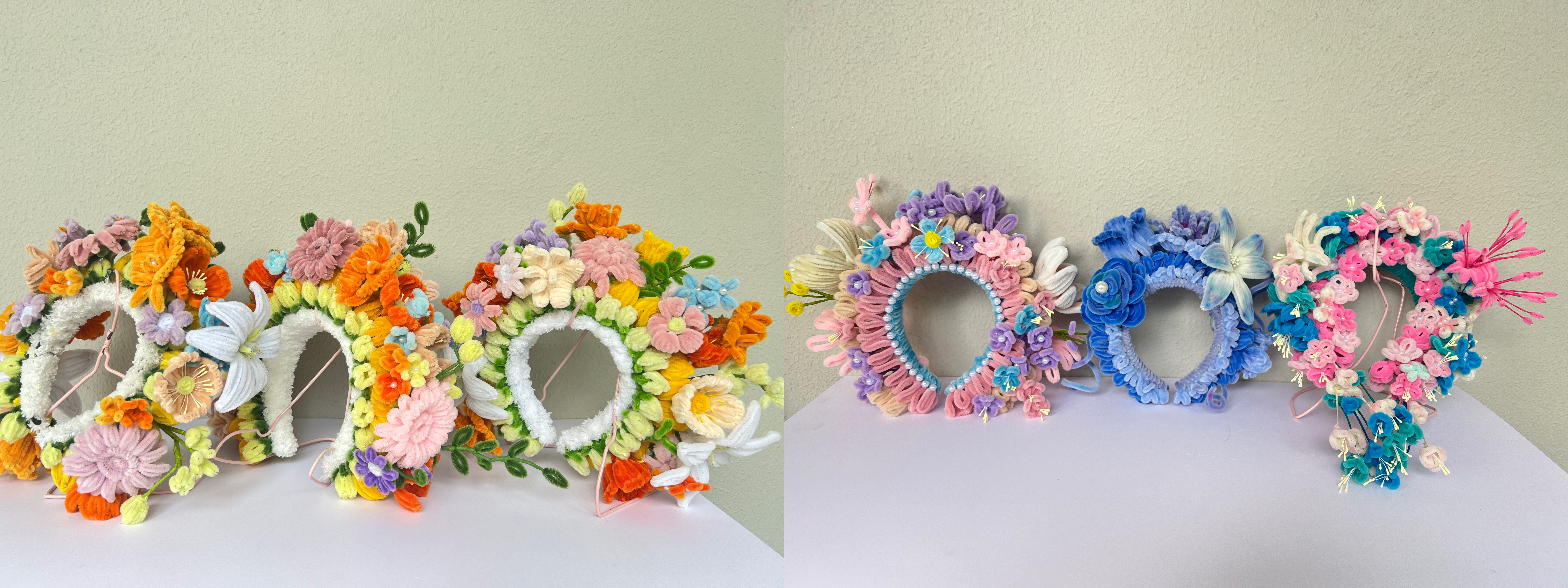 扭扭棒材料的引入旨在保留簪花传统文化的同时,打破传统簪花制作对鲜花材料和技艺要求较高的局限,学生用扭扭棒对簪花的色彩造型进行创新设计,融入现代时尚元素,让古老的簪花焕发出时尚活力。