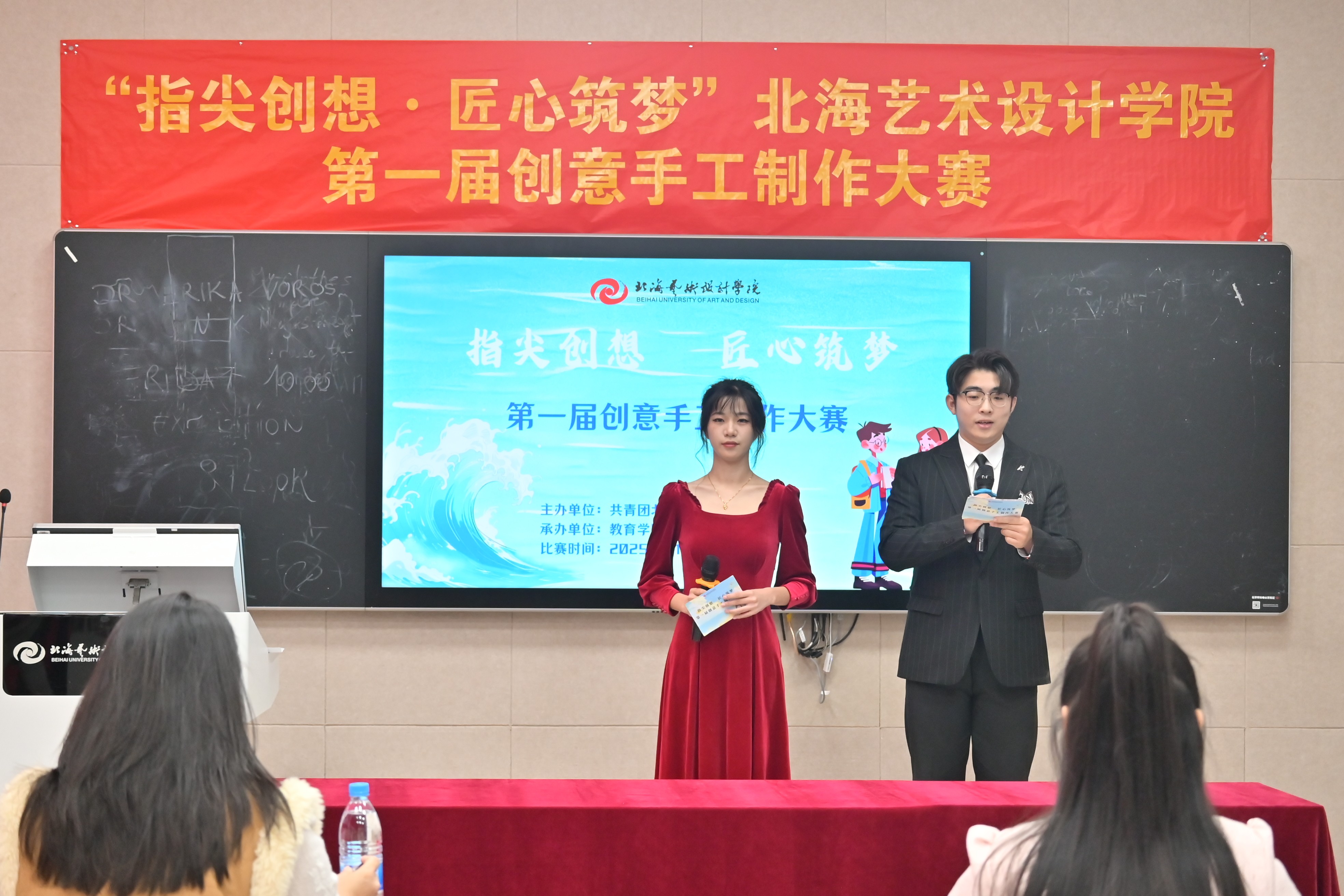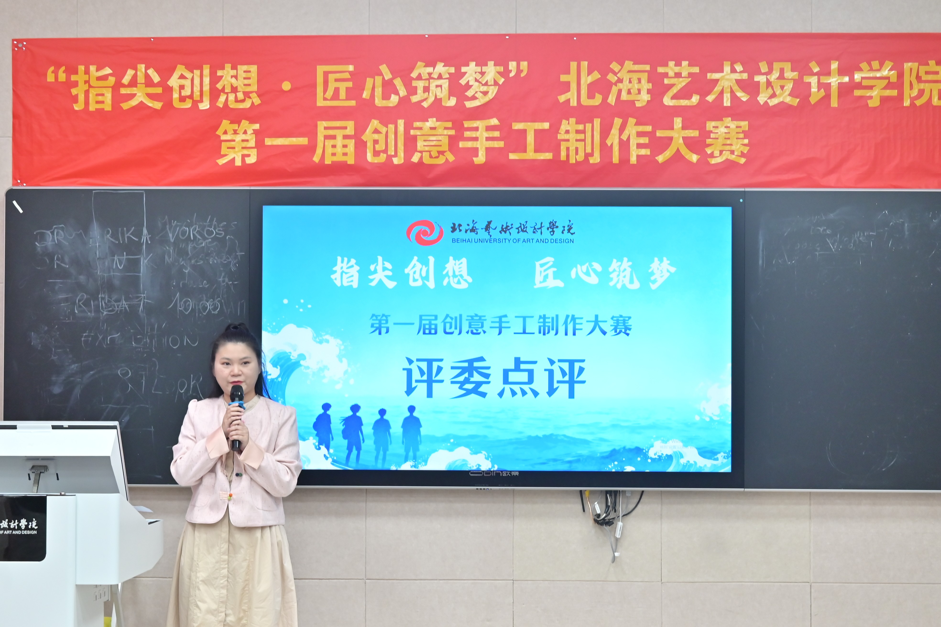 进一步提高我校学生实践创新能力,推动传统手工艺技艺与现代设计思维深度融合,搭建青年学子艺术才华展示与竞技平台11月21日共青团北海艺术设计学院委员会主办教育学院承办的指尖创想 匠心筑梦北海艺术设计学院第一届创意手工制作大赛决赛在西校区图书馆506智慧教室顺利举行。教育学院院长熊秀峰、副院长周劲志、书法学院副院长李家琪,以及各二级学院分团委书记出席决赛现场。美术学院创新创业工作负责人韩洋、教育学院张雨悦老师、马克思主义学院张鸿悦老师应邀担任决赛评委。