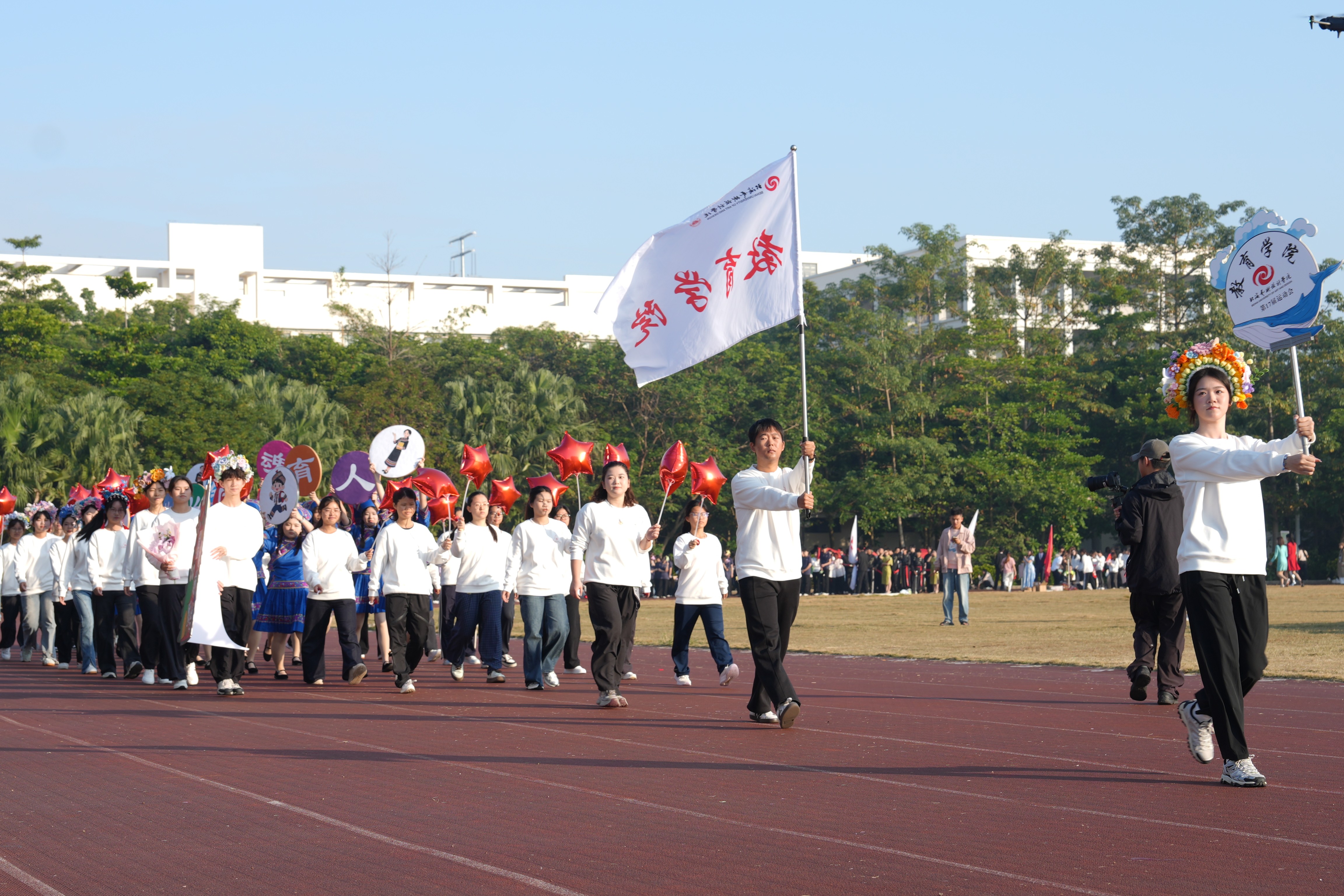 2025年12月19日至20日,我校第十七届运动会在东、西校区田径场顺利举行,教育学院全体师生积极参与并取得优异成绩。教育学院党支部书记黄思敏与学生代表共同参与开幕式方阵表演。