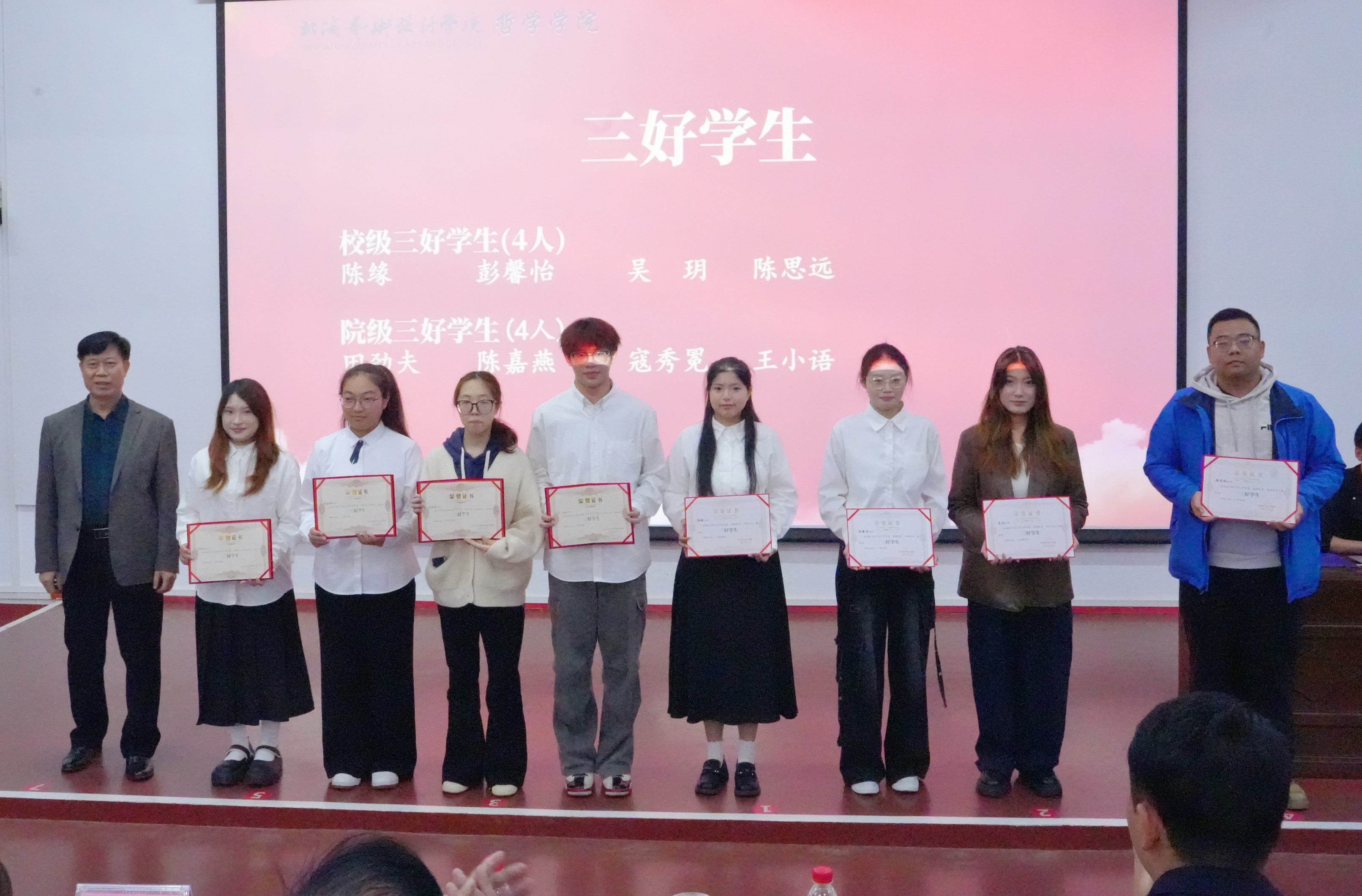 在颁奖环节,大会依次对优秀学生先进集体进行了表彰。获奖者包括军训优秀标兵2人,优秀迎新志愿者3人校级优秀共青团员2人优秀共青团干部2人校级优秀学生干部9人校级和院级三好学生8人优秀学生奖学金获得者6人筑梦奖学金获得者李晶晶自治区人民政府奖学金获得者陈嘉燕国家励志奖学金获得者郝悦田劲夫、吴玥,国家奖学金获得者哲学2301班彭馨怡还包括优秀内务寝室、校级文明宿舍、优秀班集体、五四红旗团支部8个先进集体。学院领导和教师代表依次为获奖学生颁奖。
