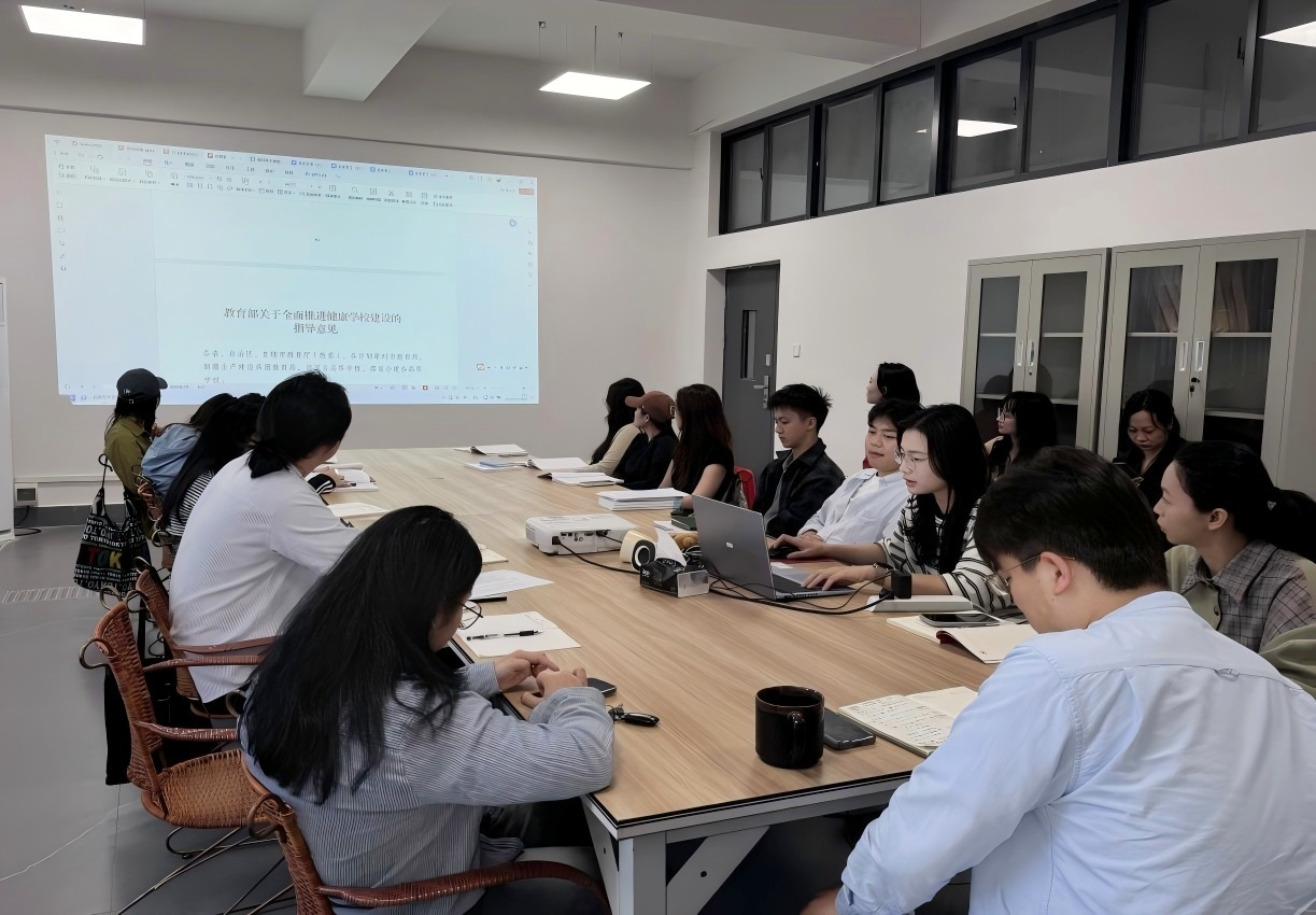 随后,党支部书记岳莹带领大家深入学习《教育部关于全面推进健康学校建设的指导意见》和中华人民共和国教育部令第41号《普通高等学校学生管理规定》。岳书记指出,健康高校建设的核心在于筑牢师生身心健康防线要将心理健康与身体健康同部署、同落实,着力构建全方位、全流程的健康保障体系。另外,辅导员作为学生健康管理与思想引导的一线力量,应立足学生日常身心状态监测,搭建高效畅通的家校协同机制,将校内精准干预与家校联动疏导紧密结合,切实守住学生身心健康底线。此外,书记提出要扎实开展体育、美育与劳动教育,督促学生积极参与体育锻炼与文艺活动,引导学生在实践中不断提升综合素养。