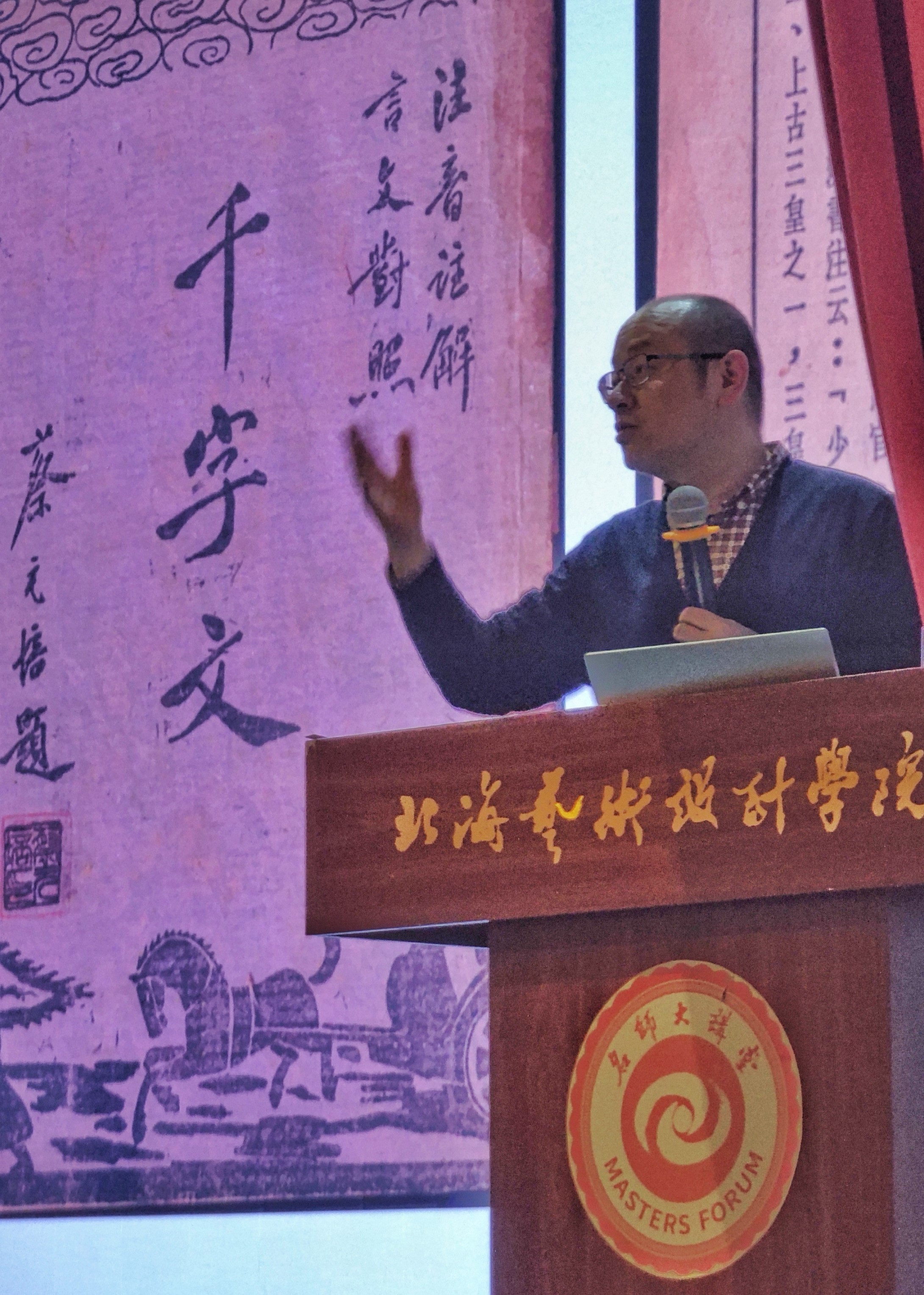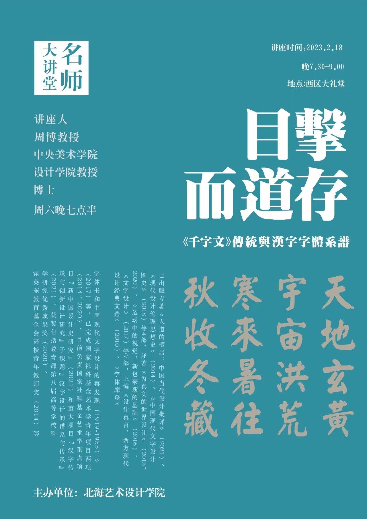 2023218日晚7:30,中央美术学院周博教授于北海艺术设计学院西校区大礼堂,为美术学院师生开展题为《目击而道存:<千字文>传统与汉字字体系谱》的专题讲座。