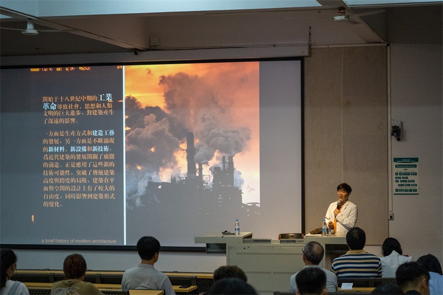 讲座伊始,陆志成教授简单介绍了世界现代建筑在年代、产业、哲学和美学的演变,以及他对建筑行业与环境设计专业的见解,从而延伸出世界现代建筑演变与环境设计专业的关联性。