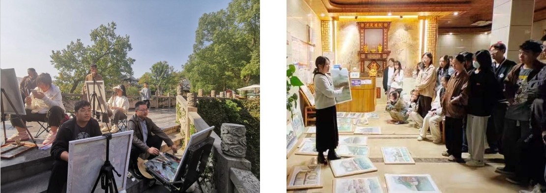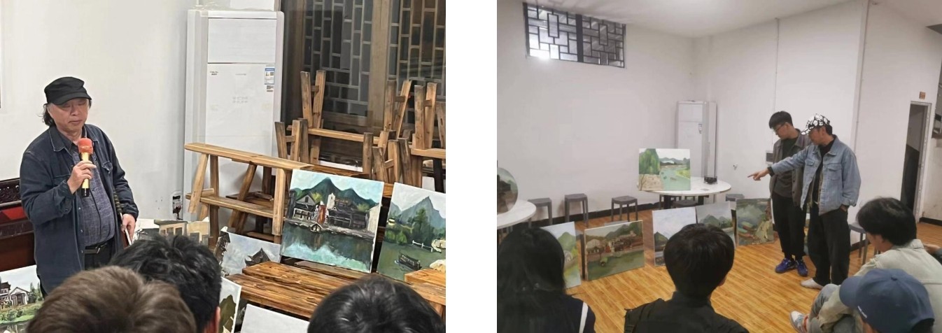 写生是一个循序渐进的过程,白天同学们在老师的带领下尽情地开展户外写生活动,感受当地自然风光与风土人情。晚上的习作讲评则是检验和反哺教学不可或缺的必要环节,美术学院的教师们认真负责地对每一位同学的画作进行讲评、逐一细化并给予示范指导。