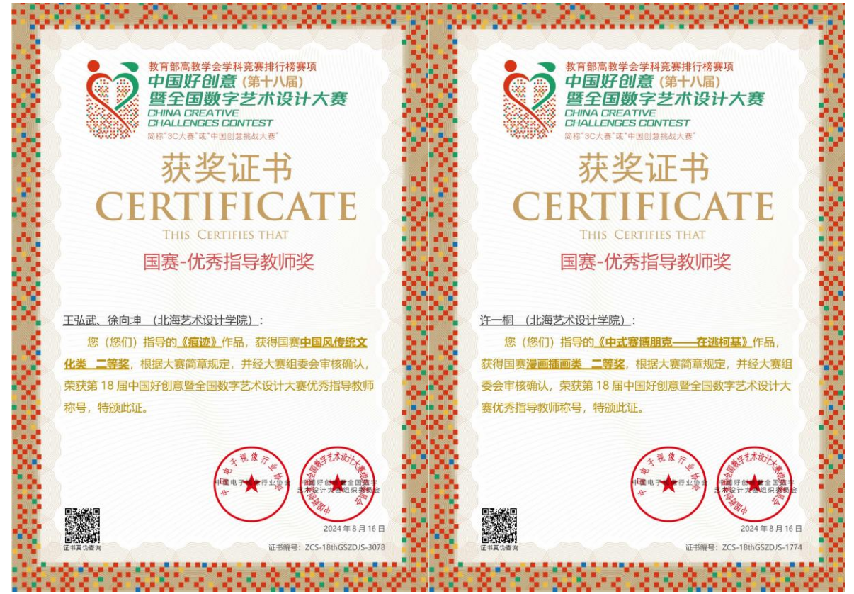 在第18届好创意暨全国数字艺术设计大赛中,动画与传媒学院作品《爱国歌》斩获国赛一等奖,作品《中式赛博朋克——在逃柯基》《生肖纹》《痕迹》《手艺在赣》荣获国赛二等奖,《药叮咚》《呐喊》《璀璨即墨》等11件作品荣获广西壮族自治区省赛奖项。学院张丽君、陈蔓延、谭湘虎、许一桐、鲁天航、王弘武、徐向坤7名老师获评为优秀指导教师。
