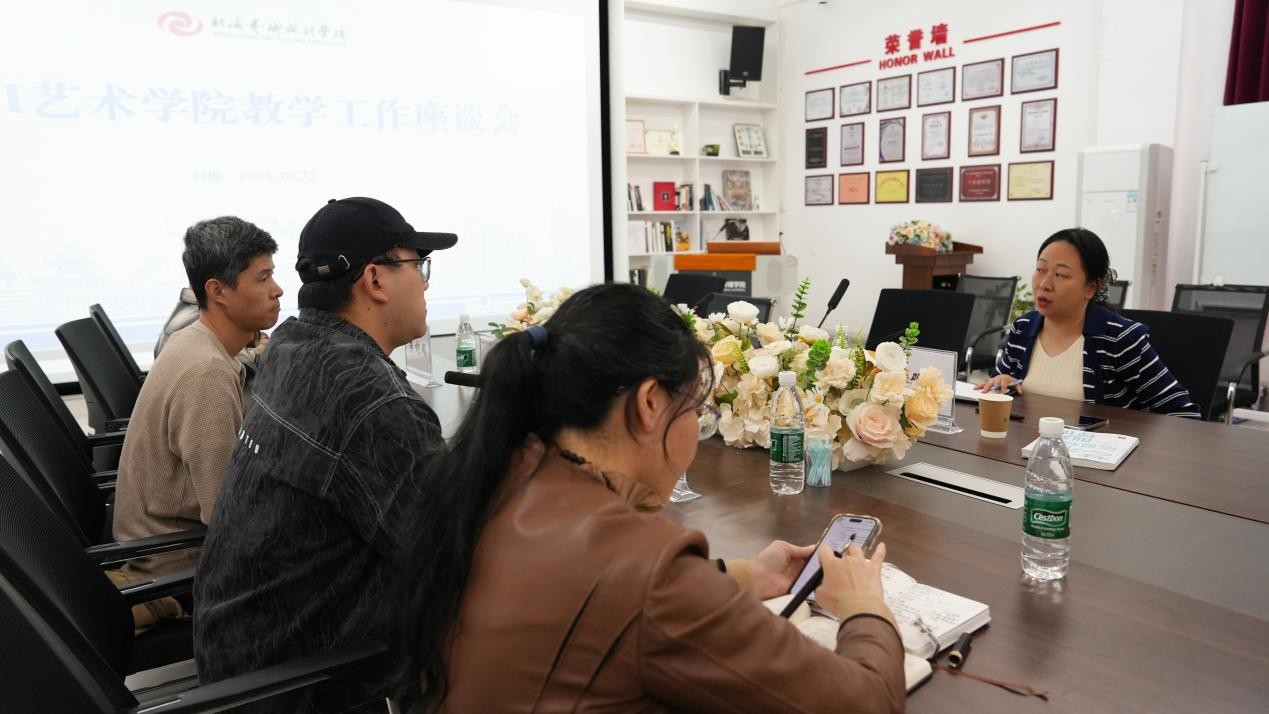 2025年10月22日下午,教务处副处长吕雅婷走进AI艺术学院,与学院教师在综合楼四楼演播厅开展本学期教学工作座谈会。AI艺术学院党支部书记芦庆芳、院长顾伟光、副院长李剑阁以及各部门主任、骨干教师代表参加会议。座谈会围绕“艺术与科技专业课程体系建设与未来发展方向”主题展开深入研讨,并就学生当前的学习现状进行了交流与分析。