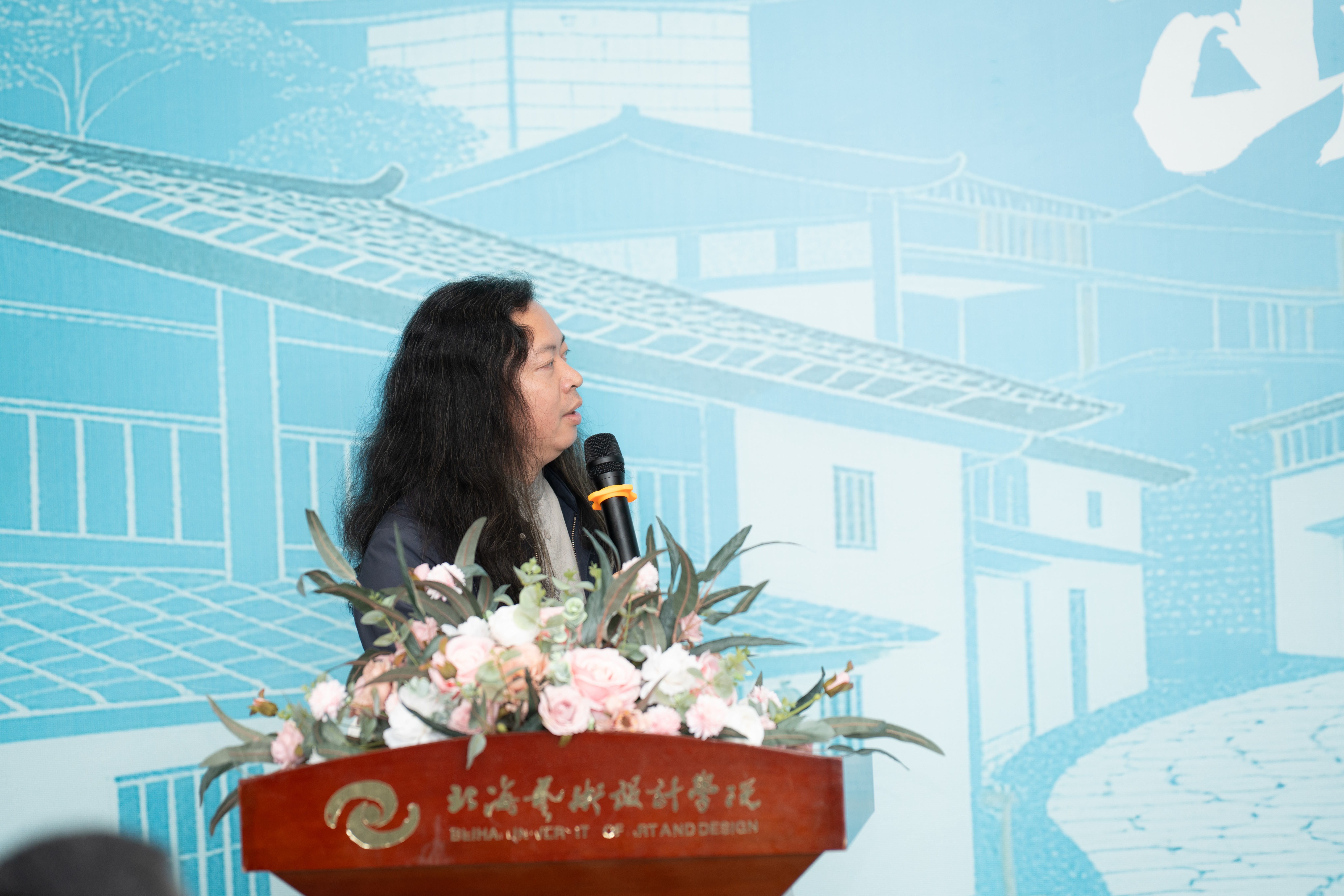 随后,刘斌教授致辞发言。其首先向莅临开幕式的各位领导与嘉宾致以诚挚谢意,同时也对参与指导的教师团队表示感谢。刘斌教授提到,本次写生活动不仅是学科建设中的一项重要实践教学,更是师生共同走进自然、领略美术魅力的宝贵契机。其指出,广西独具特色的自然风光与人文底蕴,为写生创作提供了充沛的素材与灵感来源;写生作为美术教育的关键组成部分,帮助学生通过艺术的眼光感知世界,并在此过程中取得明显成长,本次展览也充分体现了同学们的青春活力与对自然的深度感知。谈及教育理念时,刘斌教授强调,教学团队旨在通过这门课程培养学生对自然的敏锐觉察与对美的细腻感知。他们期待学生不仅能生活,更能学会品味身边的美好,唤醒对自然与人文之美的自觉感知。每一次写生实践,都是一次引领学生发现并感悟生活之美的教学尝试。