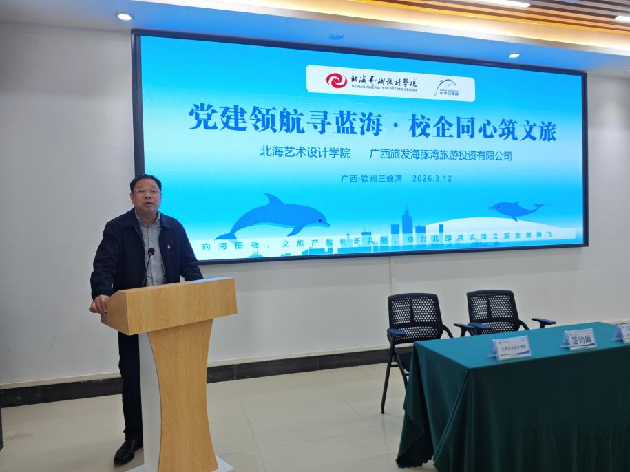 在各方嘉宾的共同见证下,校企双方举行隆重的签约仪式。北海艺术设计学院与广西旅发海豚湾旅游投资有限公司签署校企合作协议,广旅海豚湾党支部还分别与学校美术学院党总支、影视动画学院党总支、设计学院党总支签署党建共建协议,四份协议的签署标志着校企双方正式建立深度合作关系,在党建联建、产教融合、专业实践、人才培养等领域开启协同发展新篇章。 签约仪式后,校企双方围绕“党建+海洋开发利用和保护+专业实践”开展专题交流研讨。双方党员代表结合中华白海豚生态保护、文旅项目党建赋能、校企协同育人等核心话题,分享党建工作经验,交流合作思路,就如何将学校写生、文创、短视频专业优势与海豚湾公司“出海寻豚”文旅IP深度结合,推动文创产品开发、短视频宣传推广、研学实训基地建设等具体合作事项展开深入探讨,进一步凝聚了党建共建、产教融合的合作共识,强化了党员服务产业发展、助力人才培养的责任担当。 随后的总结寄语环节,校企双方代表对本次活动成果进行梳理,明确了后续党建联建活动开展、出海寻豚项目实训合作落地、文创开发与宣传推广推进等具体计划,达成了构建长效合作机制的一致共识,全体参会人员合影留念,定格校企携手的重要时刻。
