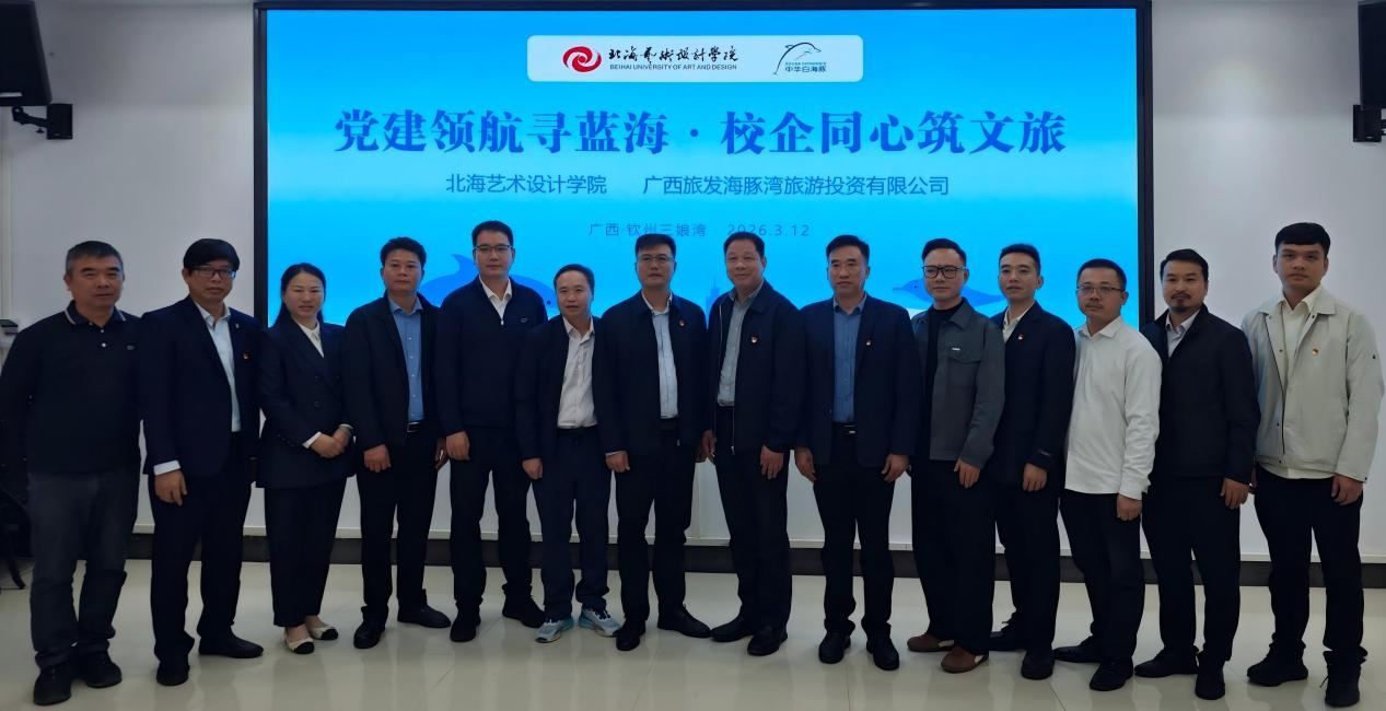 为深入贯彻新时代党的建设总要求,深化校企党建共建与产教深度融合,结合学校专业优势,搭建校企互联互通、资源共享、优势互补的交流平台,深入拓展毕业生就业渠道并强化产教融合。2026年3月12日上午,学校党委书记覃宪儒,党委委员、副校长陶立阳,校长助理、设计学院院长李林平,校长助理、美术学院执行院长龚为,美术学院党总支书记韩玮,校长助理、影视动画学院党总支书记张帆,设计学院党总支书记黄锦,校党委组织部组织科科长倪喆恒,美术学院综合办副主任景思晔一行,赴广旅海豚湾旅游投资有限公司开展交流访问。此次活动聚焦强化校企凝聚党建合力,推动专业教学与文旅实景实践深度衔接,助力学生专业技能落地提升,深挖文创开发、宣传推广、研学实训价值,实现党建工作、文旅产业、专业育人同频共振,打造“党建+文旅+专业”校企共建特色品牌,构建长效合作、互利共赢的发展机制。