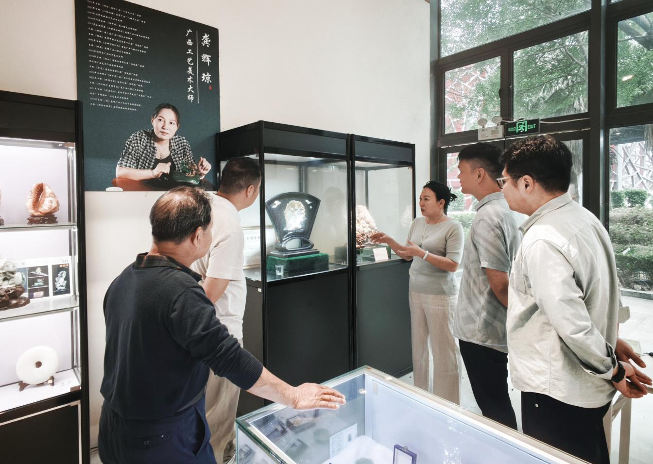 学院团队通过与中国工艺美术大师、国家级非遗合浦角雕传承人白耀华、广西工艺美术大师龚辉琼深入交流,实地了解玉雕、合浦角雕的非遗文化内涵、传统工艺技法与行业人才需求,围绕岗位供给、实习实训、技艺传承等方面展开探讨。