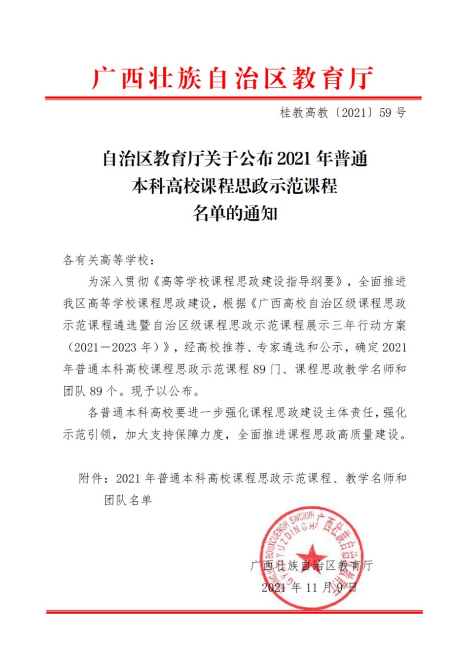 近日,根据《自治区教育厅关于公布2021年普通本科高校课程思政示范课程名单的通知》(桂教高教〔2021〕59号),北海艺术设计学院美术学院《风景写生》被教育厅认定为2021年自治区级课程思政示范课程。龚为、肖玺、唐海、罗秋梅、张湘中、陈建江、段凝老师获得自治区课程思政教学名师称号,并获思政教学团队称号。这是我校在自治区级课程思政建设上的新突破。