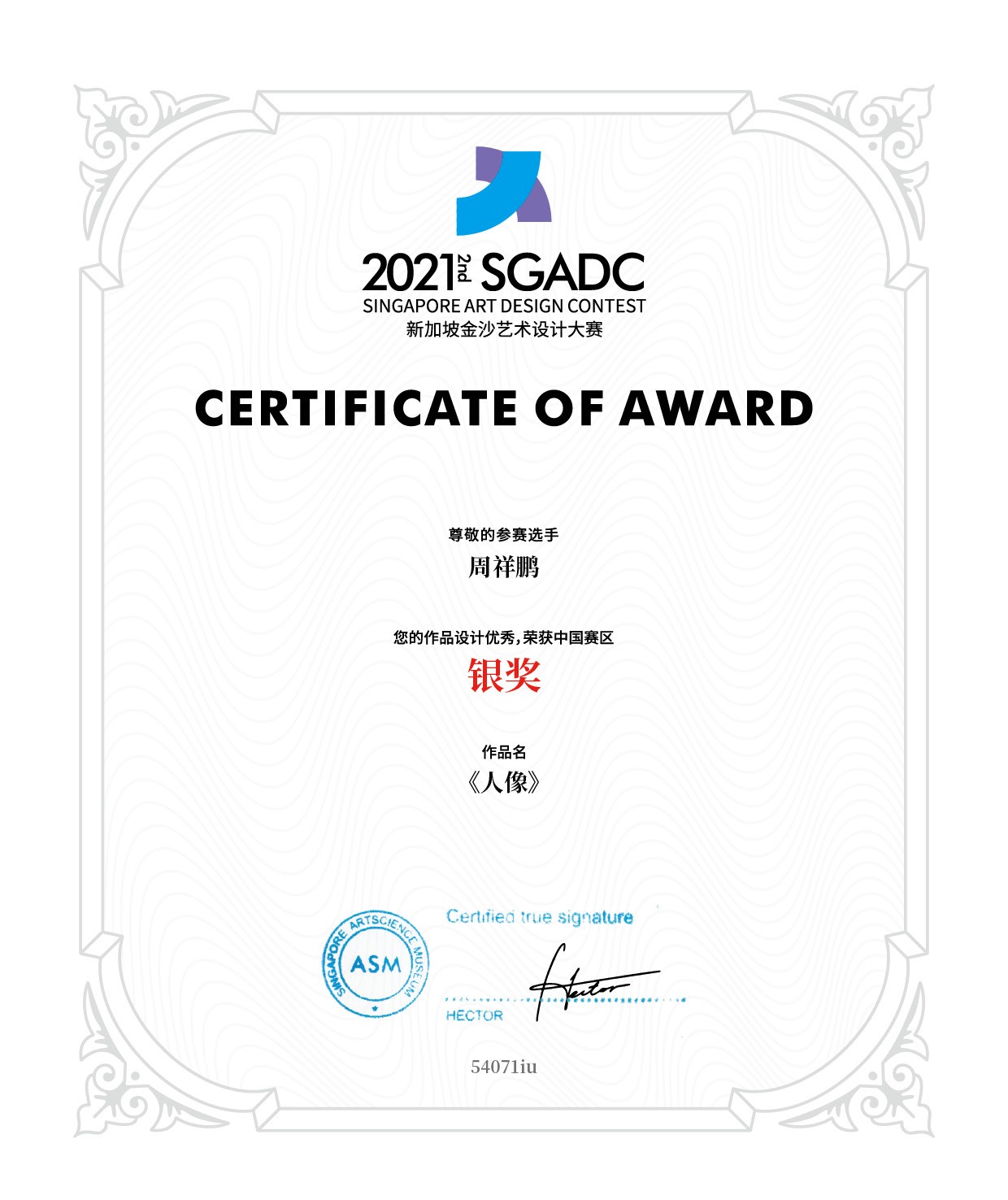 摄影系2019级学生周祥鹏的《人像》在2021新加坡金沙艺术设计大赛中荣获中国赛区银奖,新加坡金沙艺术设计大赛由新加坡新闻通讯及艺术部发起,新加坡国家艺术理事会视觉艺术部主办,新加坡金沙艺术科学博物馆与新加坡文艺协会联合承办。此次活动面向新加坡以及亚太地区各高校、专业设计机构、自由设计师。