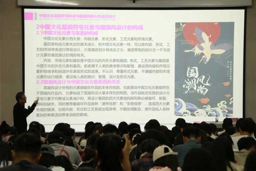 讲座伊始,范凯熹教授详细讲述了讲座课题的由来,并将其拆分为“何为国潮设计风”“何为中国文化基因符号”“如何通过AI生成式设计呈现”三个方面进行内容讲解。他阐述了国潮是将以中国传统文化基因为主进行的再创新、再发展,国潮流行的背后不仅是中国制造、中国品牌的崛起,更是中国情怀、中国自信的彰显,进而带领在场师生深入了解中国非物质文化遗产基因数据库的建设与特点。