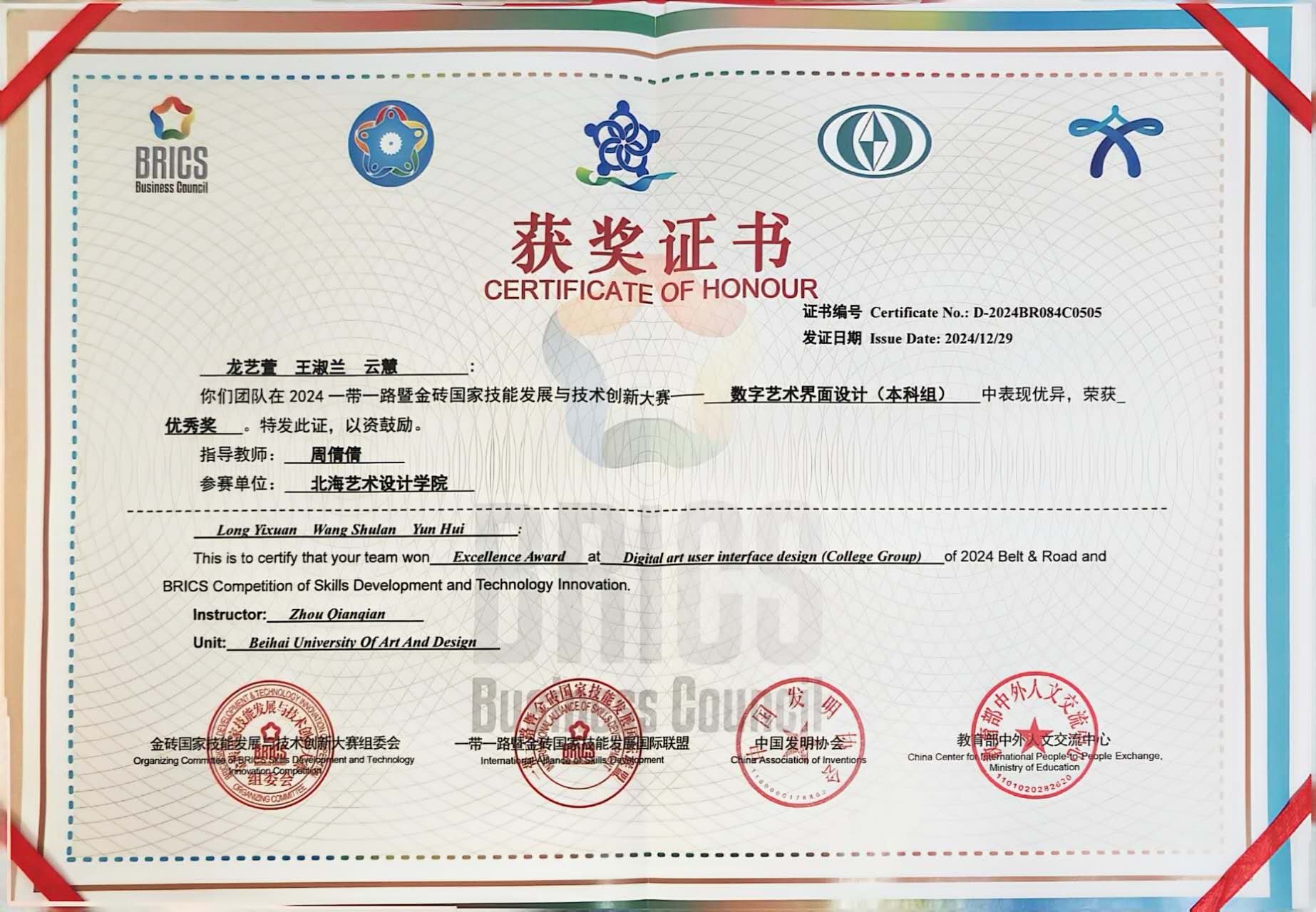 一带一路暨金砖国家技能发展与技术创新大赛是教育部官方认证的国家级A类学科竞赛本届赛事——数字艺术界面设计赛项旨在响应《国家“十四五”数字经济发展规划》及“一带一路”倡议,深化产教融合,推动人工智能与艺术设计的跨界创新吸引了全球200余所高校、超千名选手同台竞技,院师生凭借前沿技术应用与创新设计思维脱颖而出,荣获国家级二等奖1项,国家级优秀奖2项,大赛“优秀组织奖”1项,两名教师获“优秀指导教师”,彰显了学院在AI时代“数智化转型”的教学成效