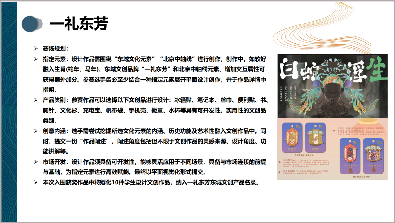 大赛设立“一礼东芳文创设计”“国际短片”“AI数字艺术”三大赛场,鼓励学生以北京东城文化地标、非遗技艺、中轴线文化等为核心进行创作。杨墨怡主任对赛事规则、东城非遗与中轴线文化的创作方向作了详细解读,并聚焦“以文创设计链接北京文化,实现从校园创作向产业实践过渡”这一核心议题,帮助学生提前感知行业动态,快速融入北京文创产业发展语境。