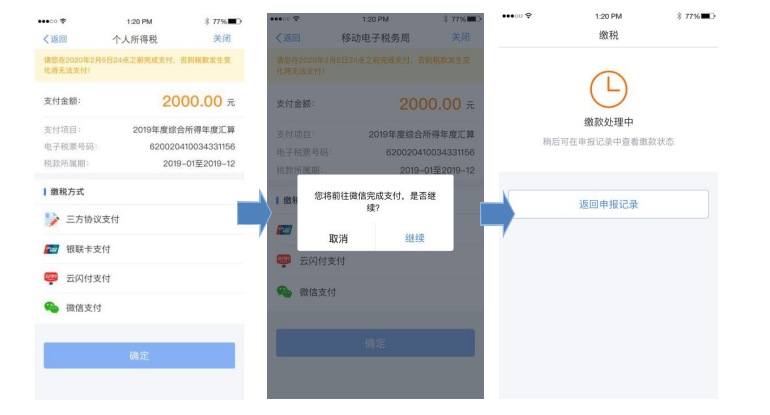 若暂不缴款可以选择【返回首页】或【查看申报记录】, 后续可再次进行缴款。