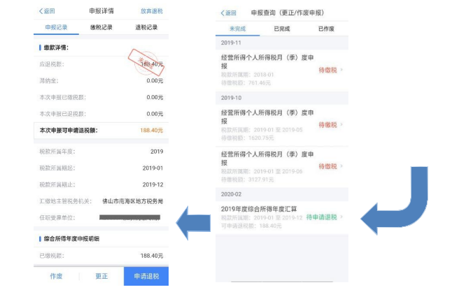 选择银行卡后提交退税申请,可以看到退税申请进度。