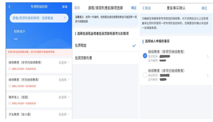 若同一专项附加扣除有重复事实或同时存在住房租金 和住房贷款利息,则系统界面上将出现提示。此时,您需要对相关信息进行确认。