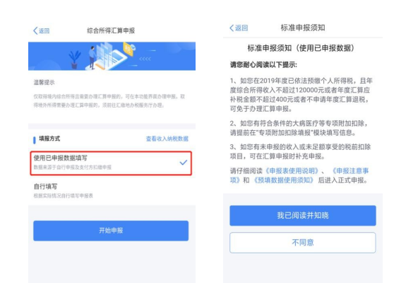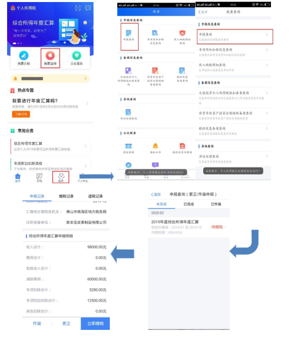 使用手机APP 端申报,您可以从以下入口进入年度汇算: 一是从首页的【常用业务】区块的【综合所得年度汇算】进入;二是从【快捷入口】-【我要办税】下或底部【办税】菜单进入后,点击在【税费申报】下的【综合所得年度汇算】。