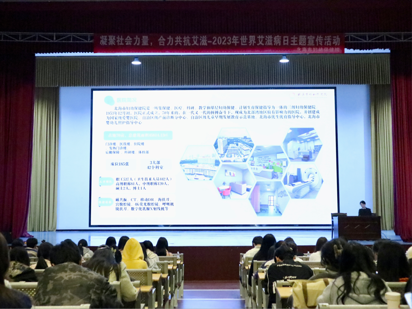 2023年12月1日,我校特邀北海市妇幼保健院副院长李雪专家联合开展了“凝聚社会力量,合力共抗艾滋”的艾滋病防治专题讲座。