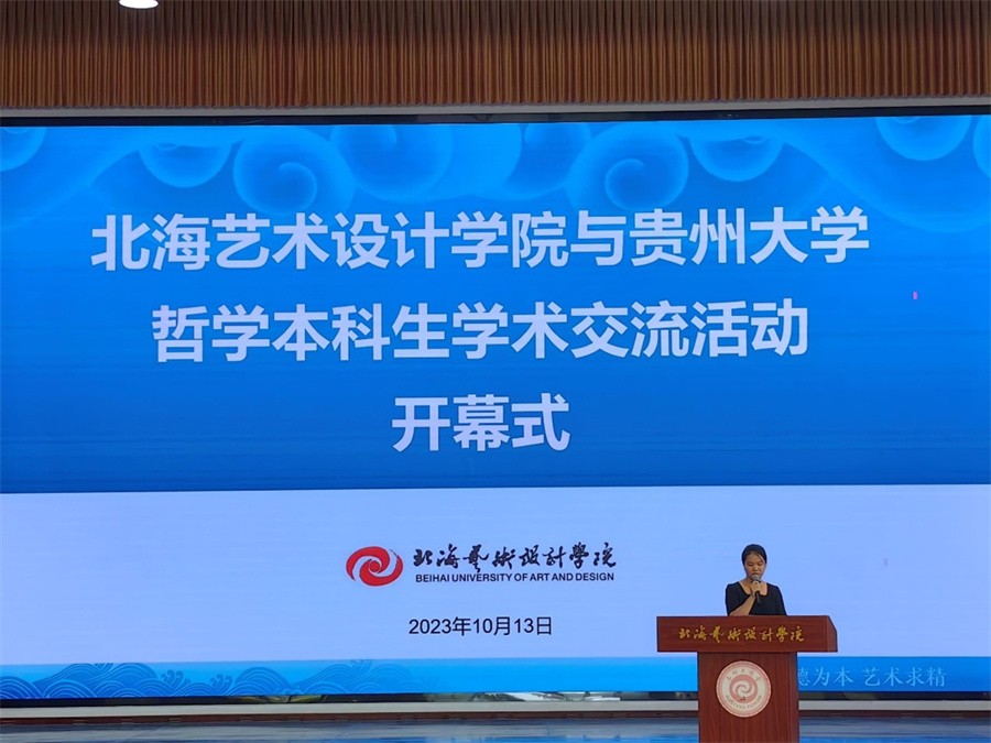 开幕式上,我校总督学王斌代表北海艺术设计学院对出席活动的领导、老师和同学表示热烈欢迎。王斌总督学介绍了我校的发展历史和办学特色。他指出,我校于2019年开办哲学、汉语言文学等新专业,并在此基础上成立了人文教育学院。在师资建设方面,我校形成名师引领、产教融合较强的应用型教学队伍。在育人教学方面,实施“3+1”(北海3年+北京1年)的培养模式,“双城育人”模式形成我校鲜明的办学特色。学生培养质量也得到社会广泛认可和普遍赞誉。哲学是人类最基本也是最深邃的学科,学校开办哲学专业,就是要充分发挥哲学专业的基础与引领作用,办好高水平大学,为社会发展作出应有贡献。王斌总督学对贵州大学哲学学院的支持与帮助表示感谢,并预祝两校学术交流、合作取得圆满成功。