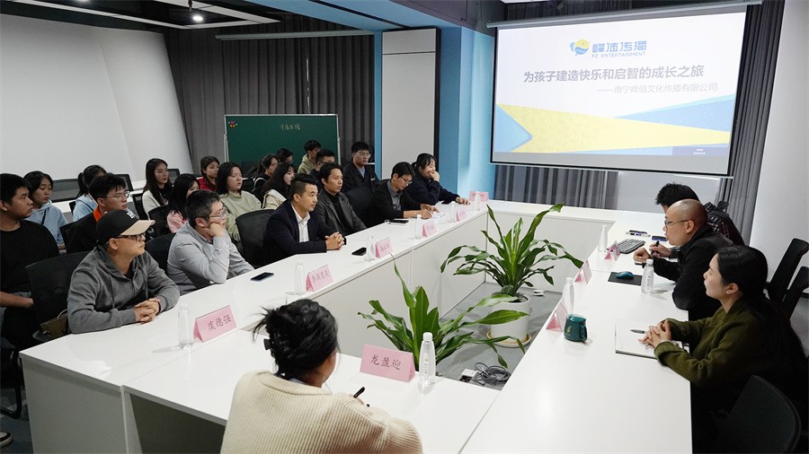 在南宁峰值文化传播有限公司,蒋林峰总经理带领我校考察团参观了该公司各职能部门,并对学生们提出的创作、就业等问题进行了一一详细解答。双方还就人才培养、行业发展等问题展开座谈交流。