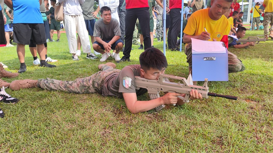 运动会现场气氛热烈,充满热血与激情,我校代表队参加个人单项3000米跑、手榴弹投掷、应急救护简易包扎伤员运送、轻武器射击、单双杠、滚轮胎、扛圆木竞速等八项比赛项目,运动员们精神饱满、斗志昂扬,展现了良好的军事素养和精神风貌。