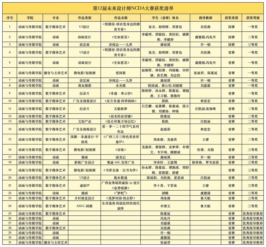 在第12届未来设计师NCDA大赛中,动画与传媒学院作品《悦膳房-陪在您身边的膳食专家》斩获国赛一等奖,作品《生如夏花》荣获国赛二等奖,作品《异闻志——九界》荣获国赛三等奖,作品《爱国歌》《非遗·香云纱》等21件作品荣获广西壮族自治区省赛奖项。动画与传媒学院陈蔓延、冯兆丹、刘嘉霖、吴佳燕、许一桐、虞德强、张丽君7位老师获评为优秀指导教师。
