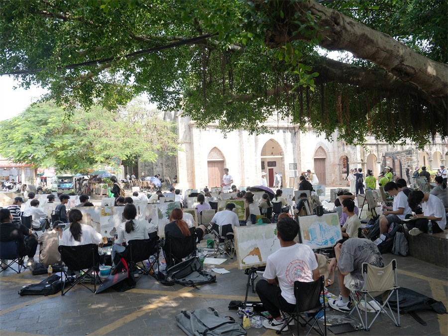 在实践活动中,学生将所学的专业理论知识与实践相结合,深入探索自然之美,挖掘艺术创作的灵感源泉,开启了一段探索自然之美与文化深度的艺术之旅。在火山地质公园和圣塘村等景点,学生在专业导师的指导下,开展了户外写生、摄影和速写等活动,他们细心观察并捕捉自然光线、色彩和形态之美,为动画创作积累了宝贵的自然与人文素材。学生漫步于南湾码头、滴水丹屏等地,用镜头捕捉涠洲岛别具一格的美丽景致,留下珍贵的影像资料,为今后专业学习和数字艺术创作储备灵感之源。除了令人叹为观止的自然美景,涠洲岛独特的人文资源和历史底蕴也为学生提供了丰富的创作素材。在天主教堂、红色广场等地,播音与主持艺术专业的学子用生动的语言诉说涠洲岛的历史故事,歌颂着革命先烈的伟大事迹,增强了民族自尊与历史使命感。