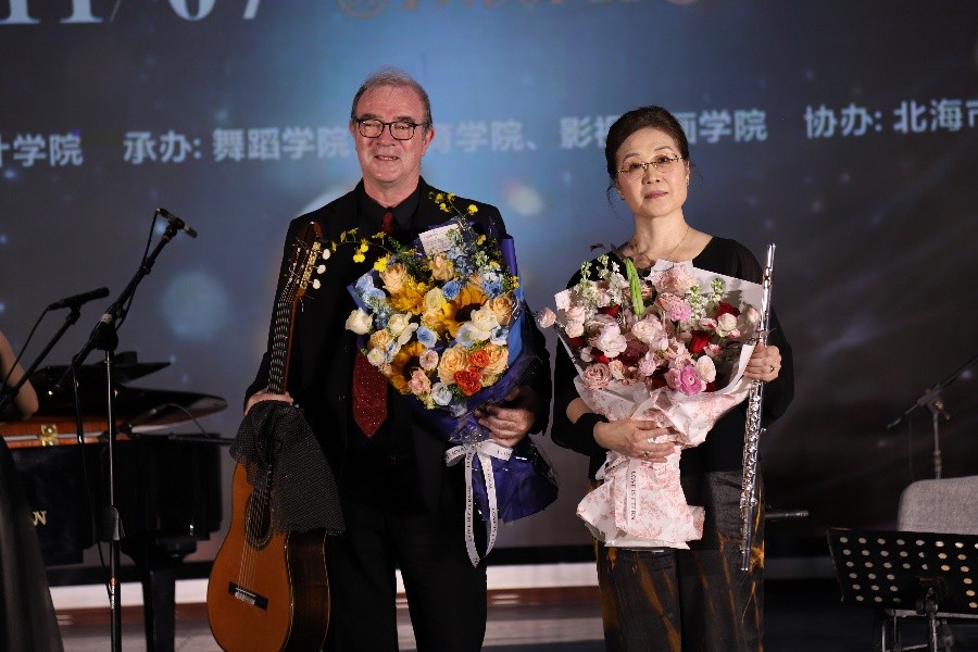 由北海艺术设计学院主办,学校舞蹈学院、教育学院及影视动画学院联合承办,北海市音乐家协会协办的“风吟弦语・古典对话”古典音乐盛宴,于11月7日在我校西校区大礼堂举行。法国古典吉他演奏家埃瑞克・佛朗塞利与旅法长笛演奏家郝雪雯联袂登台,学校常务副校长胡胜、副校长邱杰、总督学王斌,师生代表及社会各界嘉宾齐聚现场,沉浸式领略这场兼具专业深度与艺术感染力的听觉盛宴。
