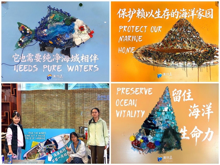 活动由书法学院常务副院长苏乃从、党支部书记喻广林及副院长韦志忍共同带队。书法学院两个批次共计77名学生分别于11月19日、20日参与了此次志愿服务。志愿服务期间,学生充分发挥专业艺术创作特长,以吸管、碎布、渔网等回收废弃物为创作媒介,在预设的海洋主题底图上完成艺术拼贴创作。经学生创意重构,原本的日常废弃物转化为生动立体的海洋意象作品,直观呈现“资源再生”的环保核心内涵。在创作过程中,学生团队高效完成艺术作品制作,同时展现出良好的团队协作能力与执行能力,集中彰显了新时代青年服务社会、勇于担当的精神风貌。
