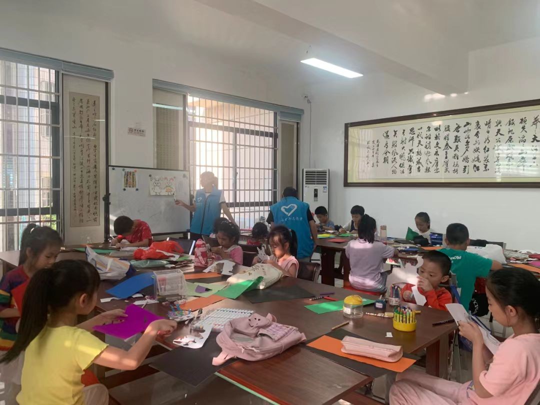 我们首先来到的是北部湾社区,正巧碰见孩子们手拿剪刀在纸上裁出他们心中的“最佳朋友”。在志愿者的指导下,两只乖巧的小兔子被小朋友们展现得栩栩如生。他们将小兔子画出形状,涂上色彩,剪出形状,虽然老师在白板上提供了模板,但小朋友们总有天马行空的想象。志愿者们也发现,每个小朋友的小兔子都不一样,那是他们独一无二的朋友。
